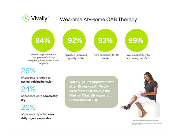 1st May 2025 Vivally Sales Postcard for Clinicians I created a postcard for clinicians highlighting the benefits of the Vivally, wearable at-home device to treat OAB. To emphasize the category leadership, I emphasized the benefits of wearable tibial neuromodulation (wTNM).